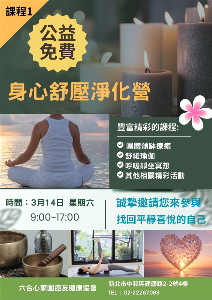 六合旋轉、靜坐、慈愛手、身心靈講座、登山、戶外活動、手工藝DIY(養生素食)